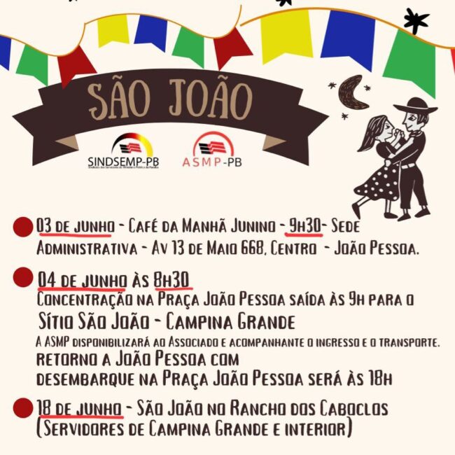 O Sindicato dos Servidores do Ministério Público (SINDSEMP-PB) e a Associação dos Servidores do Ministério Público da Paraíba (ASMP) divulgaram a programação das duas Instituições para comemorar os festejos juninos dos associados. A programação será aberta no dia 03 de junho com um café da manhã na sede administrativa do SINDSEM-PB, localizada na rua 13…