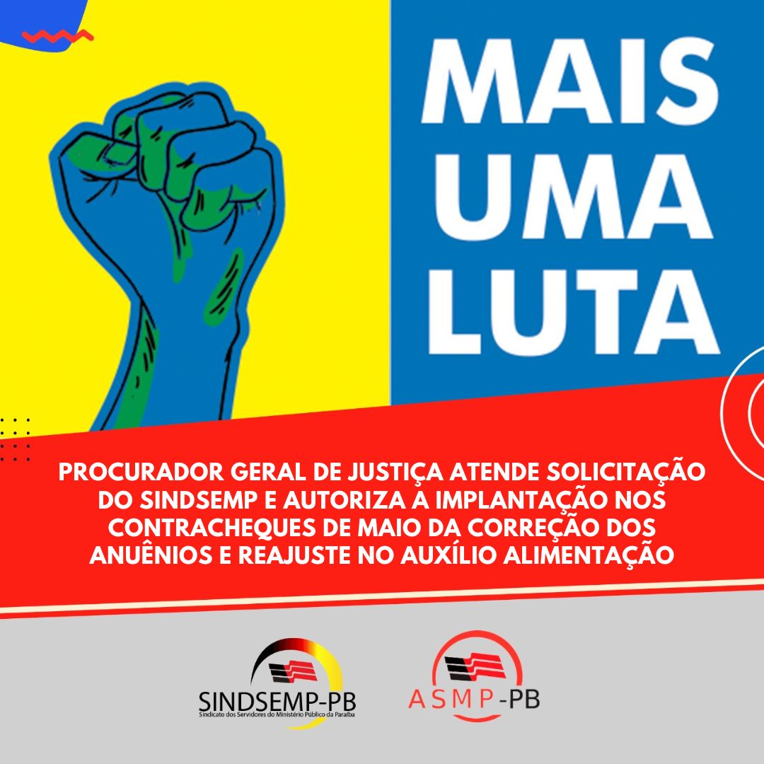 Procurador-geral de Justiça atende pleito do SINDSEMP-PB e autoriza implantação nos contracheques de maio da correção dos anuênios e reajuste no auxílio alimentação5 de maio de 2023